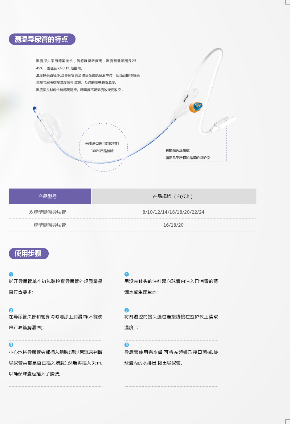 测温导尿管是一根带有温度传感器的导尿管,在导尿的同时检测体温,对于外科围术期、麻醉期间、严重感染的患者都有非常重要的意义,特别是对一些具有传染性疾病而又无法自主排尿的患者更是有重大意义。 它可以通过转换接头连接到监护仪或中央监护系统。 连续的检测膀胱温度,比监护本身携带的体温探头测量更加准确,相对更接近实际体温,对临床诊断和治疗提供有价值的依据。