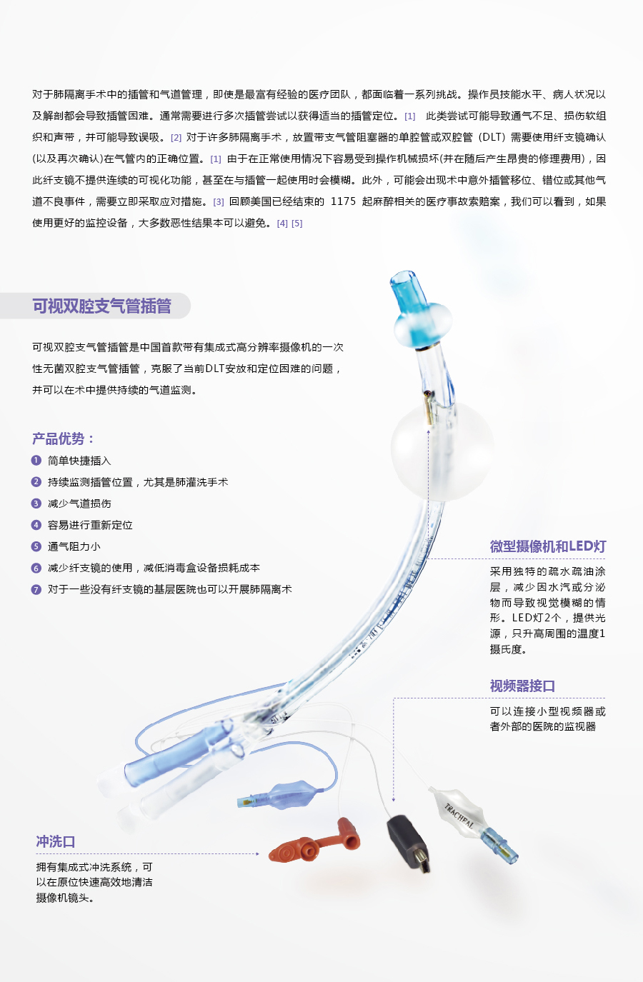 可视双腔支气管插管是中国首款带有集成式高分辨率摄像 机的一次性无菌双腔支气管插管,克服了当前DLT安放和 定位困难的问题,并可以在术中提供持续的气道检测。